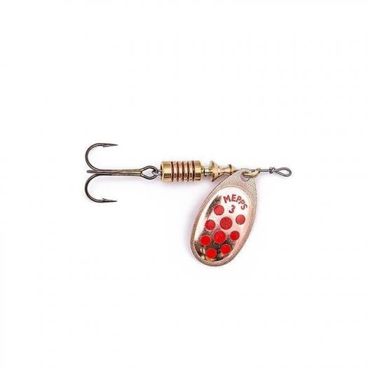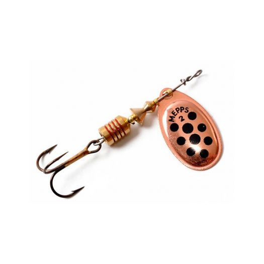 Jeden zo základných modelov rotačiek Mepps, širšie krídelko striebornej, zlatej alebo medenej farby s červenými alebo čiernymi bodkami, precízne mechanicky spracovaná, rotuje spoľahlivo.